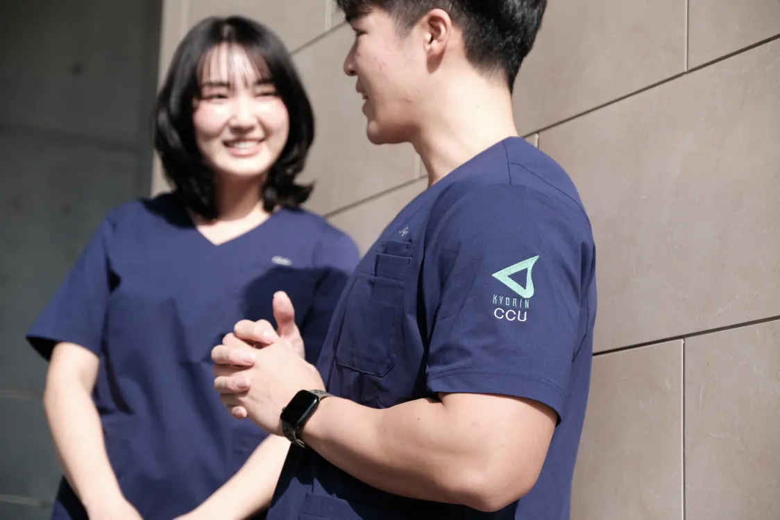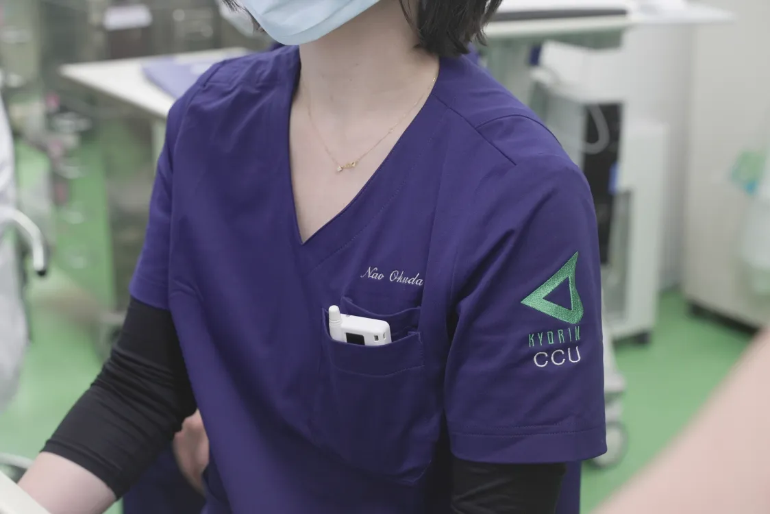 やはり伸縮性がとても効いていて、他社のスクラブとは違うなと感じています。昼休みや仮眠なども含めて1日中スクラブを着ているのですが、全くストレスに感じることがありません。男女問わず着心地が良いと評価しています。また、袖にはロゴマーク・胸元にはそれぞれの名前を刺繍していただき、クリーニングから戻ってきても紛失することがなくなりました。チームメイトしか着れないという特別感もあって気に入っています。